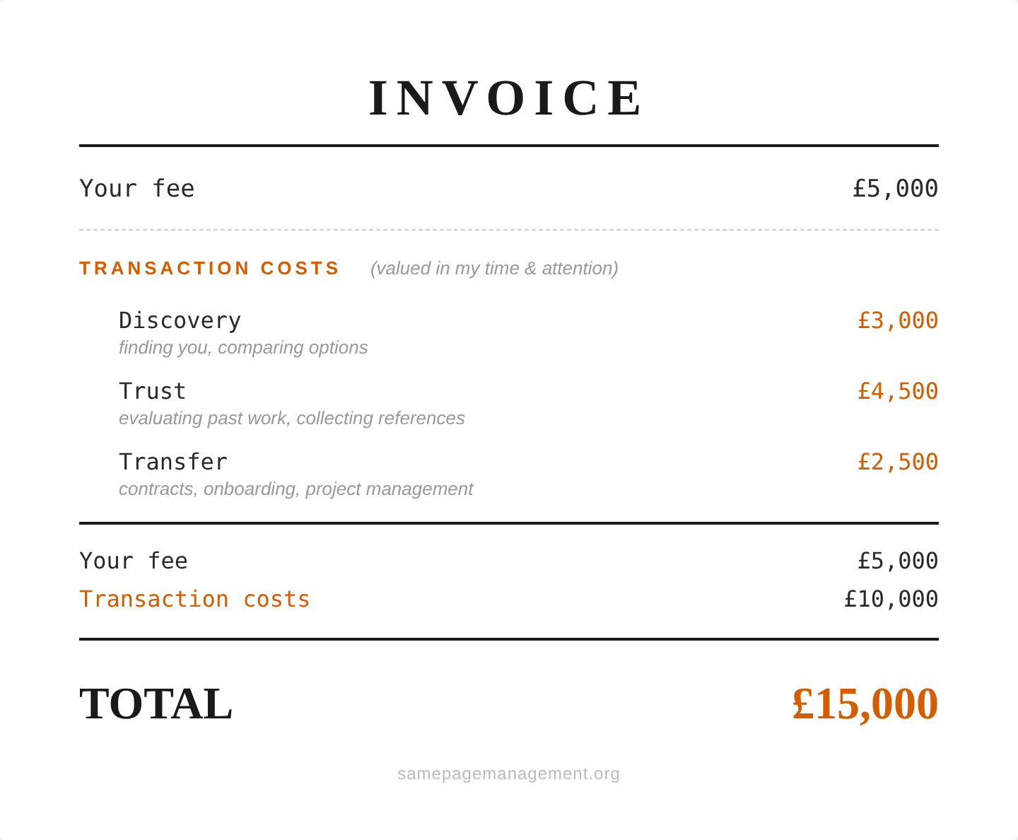 The transaction costs I have to ‘pay’ can easily be the majority of the true cost of working together.